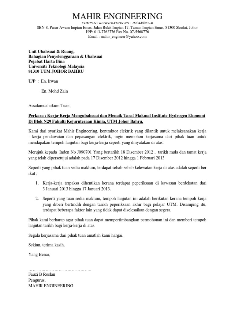 Contoh surat permohonan lanjutan masa kontrak. Contoh surat permohonan lanjutan masa projek. Contoh pengiraan kelambatan sebenar adalah seperti berikut.